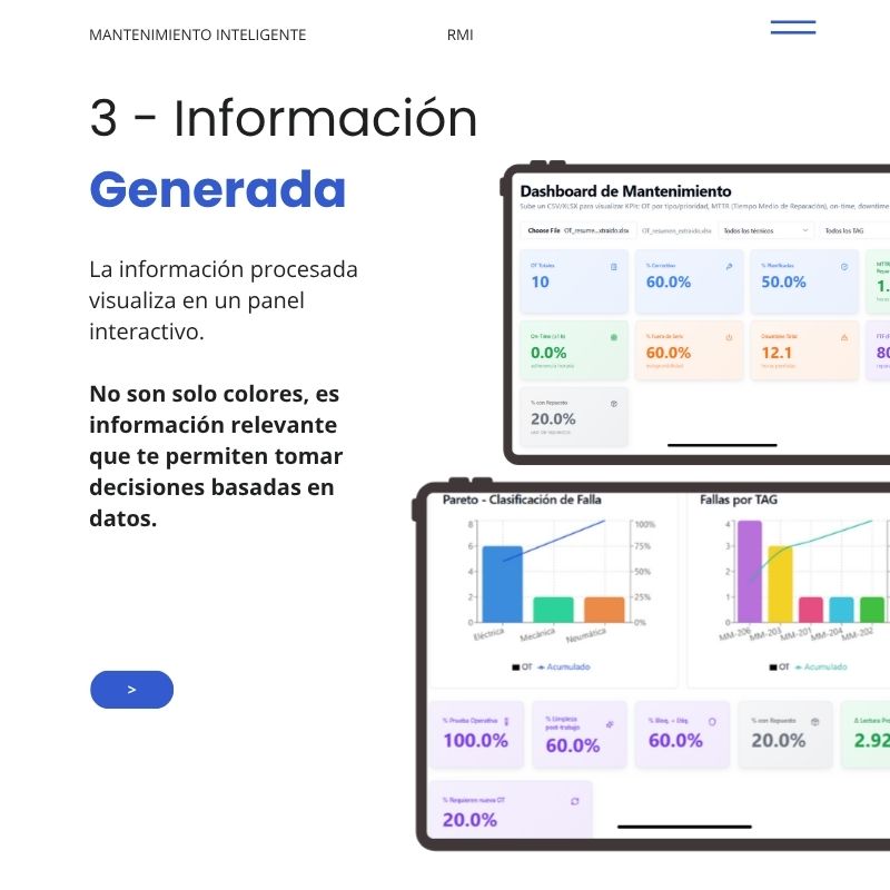 Nos integramos a tu flujo de trabajo capturando, interpretando y presentándote la información de tu mantenimiento para que tomes las mejores decisiones basadas en datos.